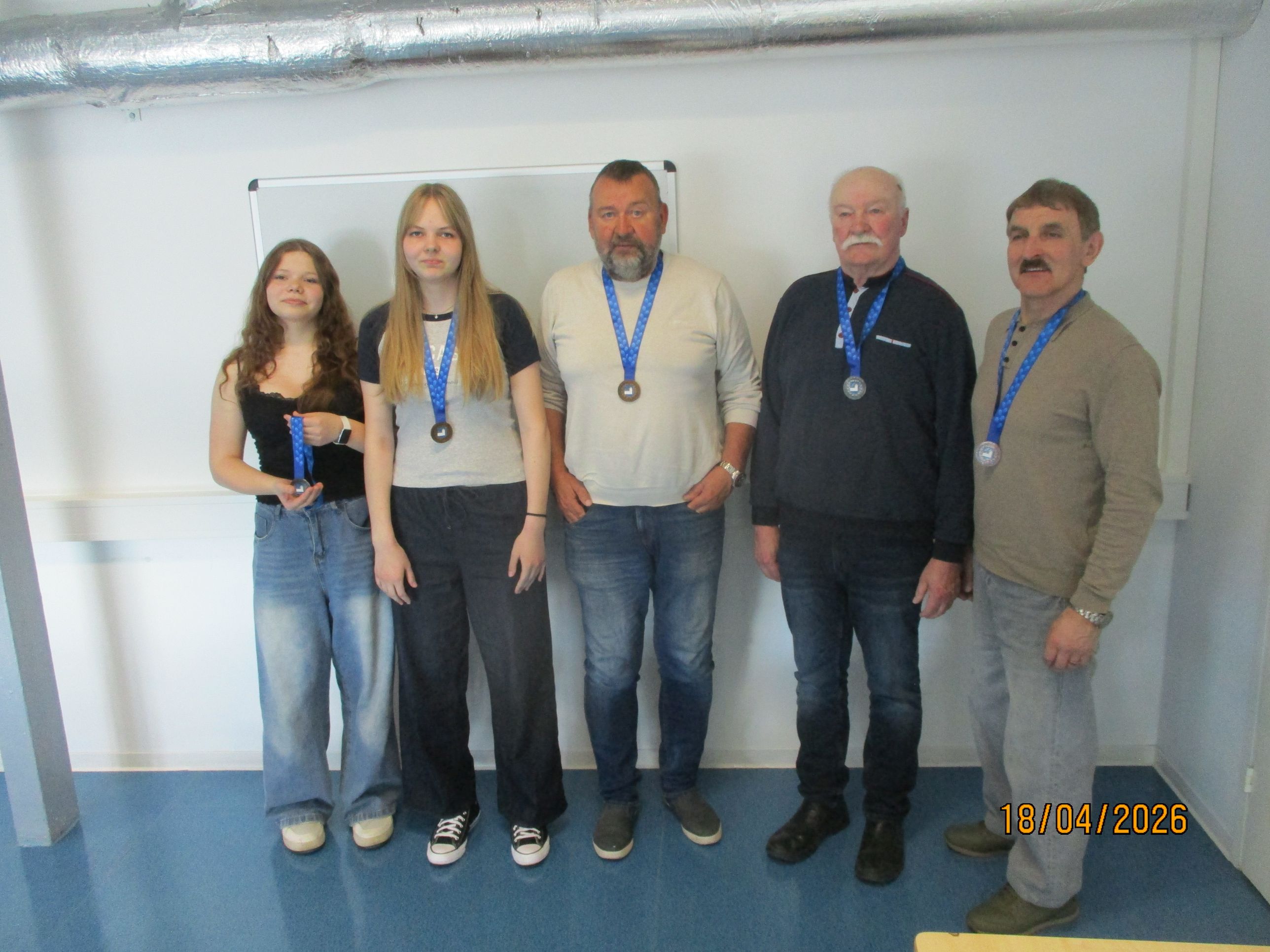 Pildil on medalistid: vasakult Jessica Bajarskas, Karin Laks, Eino Vaher, Kalev Pagar ja Sergei Novikov.